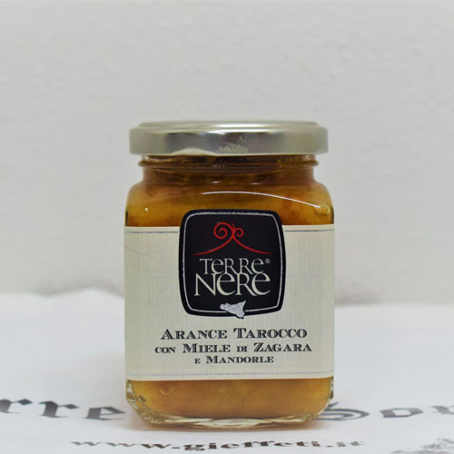 arance tarocco, zucchero, miele di zagara (2,5%), succo di limone, Mandorle (1,5%).